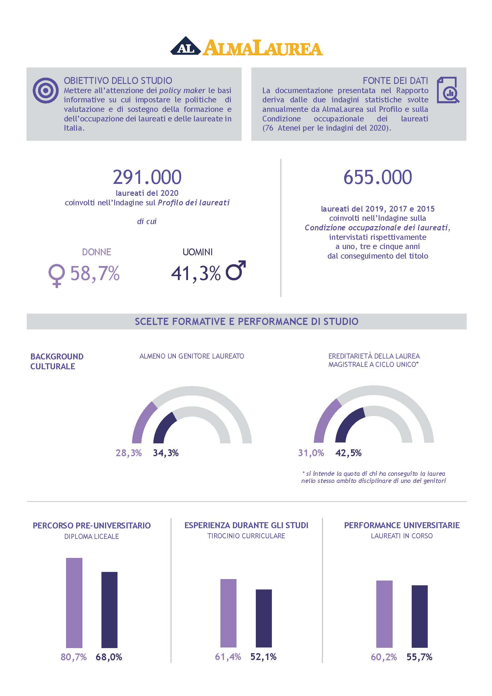 «Nel primo rapporto di genere di AlmaLaurea emerge un ruolo importante delle donne nel far ripartire l’ascensore sociale: è infatti vero che tra le laureate, mediamente più brave dei loro colleghi in ogni percorso di studio, è più frequente trovare ragazze che provengono da contesti familiari meno favoriti e che seguono con minore frequenza le orme di famiglia, nei percorsi formativi e nella professione svolta. A queste donne, innovative, il sistema Paese deve garantire parità di condizioni in termini di accesso e di status in ambito professionale». È questo l’auspicio dichiarato da Marina Timoteo, Direttore di AlmaLaurea, nel commentare la fotografia che AlmaLaurea scatta nel 2020. Un focus che ritrae un Paese in cui le donne costituiscono quasi il 60% dei laureati con performance pre-universitarie e accademiche migliori di quelle dei laureati (voto medio di diploma 82,5/100, mentre è 80,2/100 per gli uomini; il voto medio di laurea è, rispettivamente, pari a 103,9 e 102,1/110). L’analisi di AlmaLaurea sottolinea, infatti, la sovente provenienza delle donne da contesti familiari meno favoriti ed evidenzia, dunque, come esse siano state interessate da una minore selezione basata sul background familiare. Infatti, proviene da una famiglia in cui almeno uno dei genitori ha la laurea il 28,3% delle laureate e il 34,3% dei laureati; laddove, poi, i genitori siano in possesso di una laurea, le donne seguono le loro orme con minore frequenza.