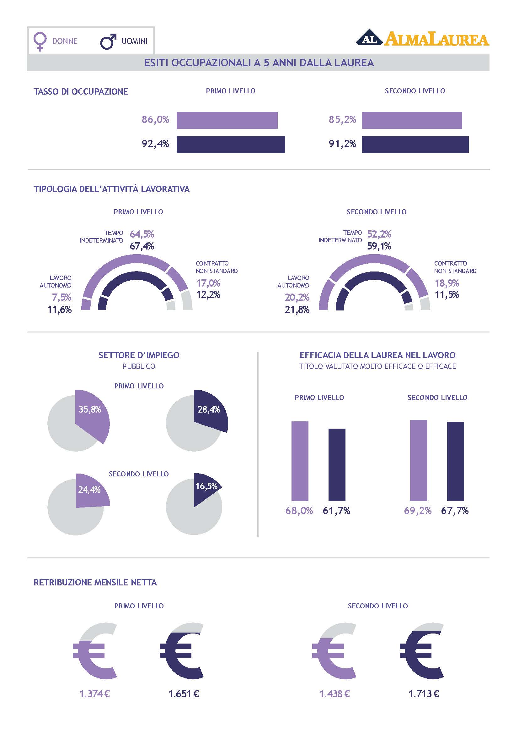 Anche in termini retributivi si conferma il vantaggio a favore degli uomini. In particolare, a cinque anni dalla laurea, gli uomini percepiscono, in media, circa il 20% in più: tra i laureati di primo livello 1.374 euro per le donne e 1.651 euro per gli uomini; tra quelli di secondo livello rispettivamente 1.438 euro e 1.713 euro.