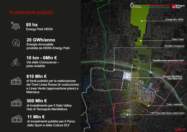 A fianco del Tecnopolo c’è la Fiera e un nuovo piano che prevede il potenziamento del fronte più urbano del distretto fieristico con la creazione di un nuovo polo dell’intrattenimento e della cultura, che ospiterà il nuovo padiglione polifunzionale, un’arena sportiva, spazi commerciali, culturali e ricreativi, progettati dallo studio MCA di Mario Cucinella; e nelle aree più a nord, proprio di fronte al Tecnopolo, un nuovo Villaggio dell’innovazione digitale, che accoglierà nuovi insediamenti di imprese, centri di ricerca e residenze. Parte integrante del masterplan è anche la riqualificazione del Parco Nord, che restituirà alla città più di 50 ettari di parco urbano e una rinnovata Arena Joe Strummer da 25 mila posti.