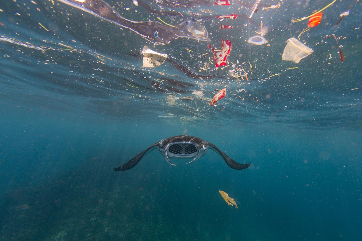 A Mantra Ray (Manta) is swimming in the ocean under plastic soup. Bali Indonesia. Manta rays are large rays belonging to the genus Manta. Plastic pollution in the ocean.
